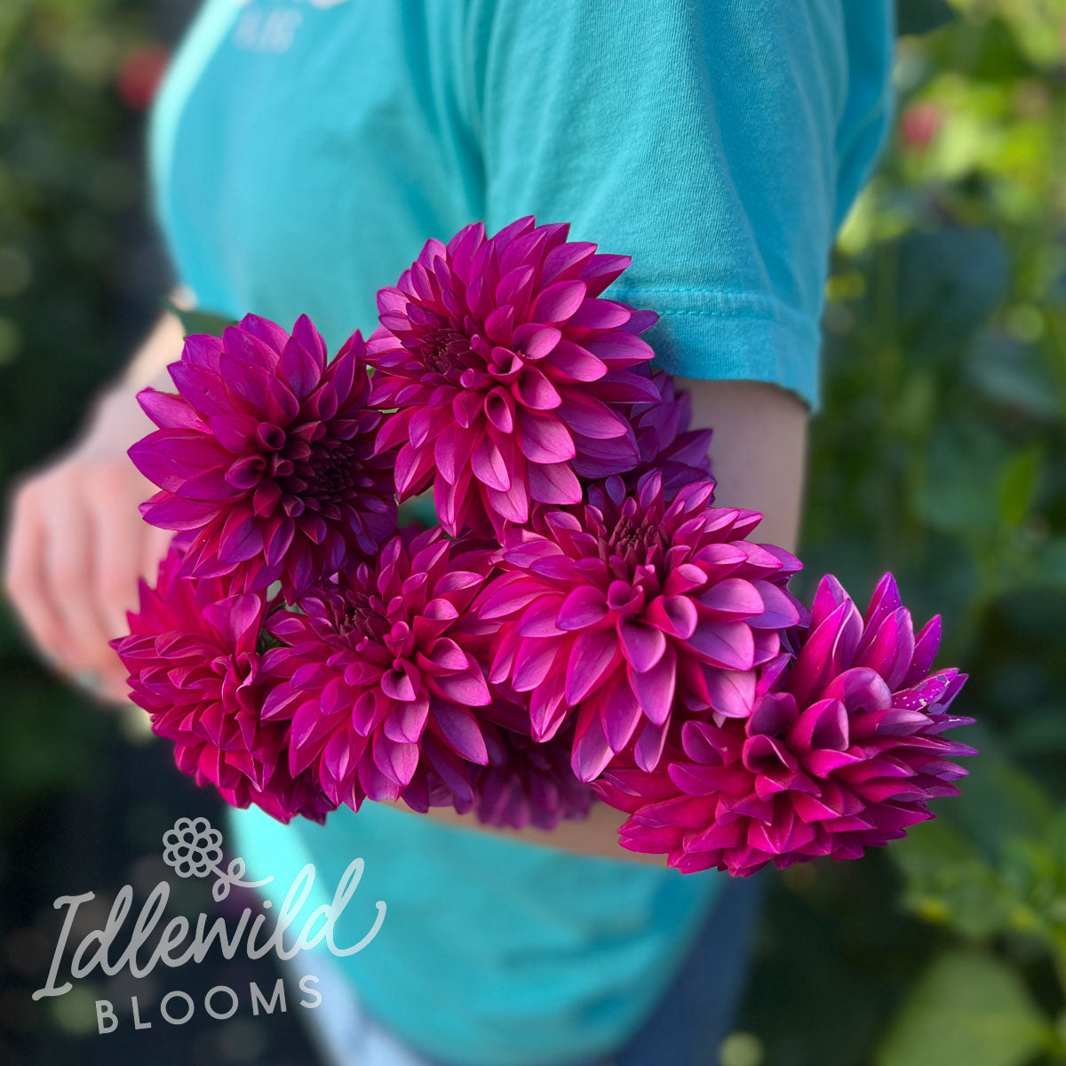 If you like Salish Twilight Girl, give her moody, sultry sister Versa a try! She has the same dark burgundy reverse petals as STG but the faces are purple. Makes a nice pop of contrast in bouquets. Where to buy Versa dahlia tubers? We sell Versa dahlia bulbs right here at Idlewild Blooms! You can wishlist Versa on this page. We typically have Versa dahlia tubers for sale in January each year and we ship in March, April & May.